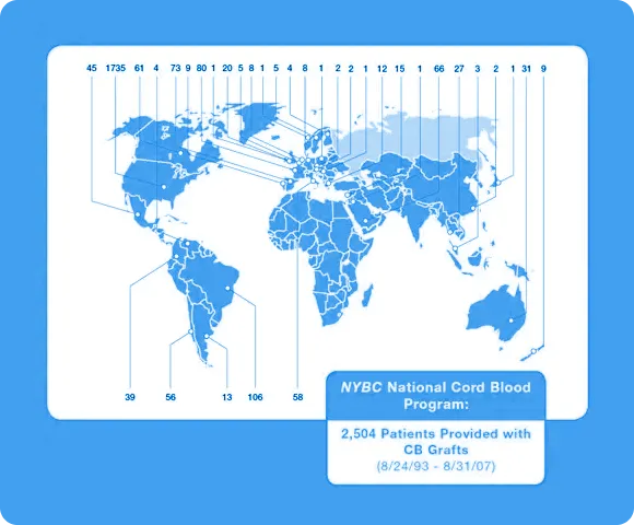 La seguente mappa del mondo riporta il numero di trapianti da sangue cordonale effettuati per ogni paese, aggiornati ad agosto 2007 (fonte: USA National Cord Blood Program – www.nationalcordbloodprogram.org).