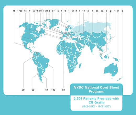La seguente mappa del mondo riporta il numero di trapianti da sangue cordonale effettuati per ogni paese, aggiornati ad agosto 2007 (fonte: USA National Cord Blood Program – www.nationalcordbloodprogram.org).