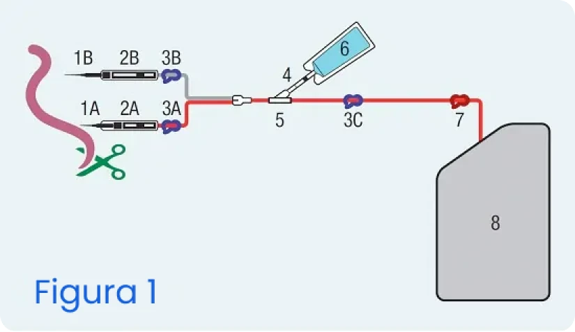 Subito dopo la nascita, recidere il cordone e disinfettarlo nel punto di prelievo che deve situarsi in posizione distale rispetto alla mamma. Rimuovere il cappuccio dell’ago svitandolo. Prima di inserire l’ago (1A), assicurarsi di avere aperto le clamps blu (3A e 3C) corrispondenti. Effettuare il prelievo e stimolare il flusso di sangue venoso cordonale massaggiando il cordone dall’alto verso il basso per aumentare il volume di sangue prelevabile. Agitare la sacca (8) allo scopo di miscelare l’anticoagulante (CPD) con il sangue raccolto dopo il prelievo (Figura 1).