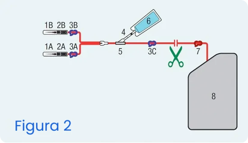 Chiudere la clamp 3C posizionandola in prossimità della “Y” (5). Chiudere la clamp rossa (7). Tagliare il tubo al di sopra della clamp rossa (Figura 2) e procedere all’imballaggio della sacca contenente il sangue del cordone come indicato nella pagina 2 del presente documento. Smaltire il tubo tagliato e gli aghi utilizzati in un apposito contenitore.