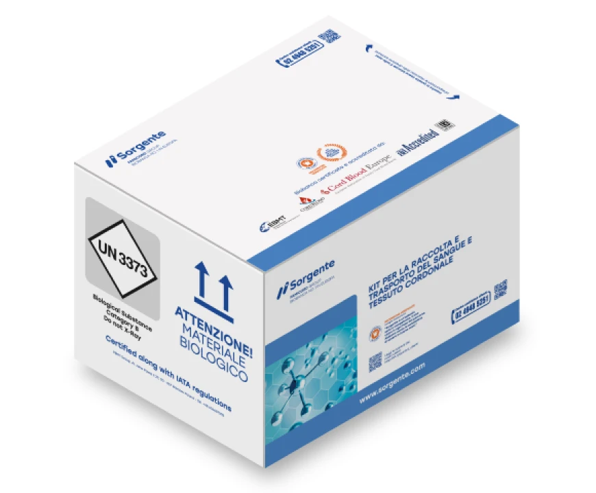 Collocare la «Specimen transport bag» contenente il sangue cordonale,il sangue materno e il tessuto cordonale (se richiesta la raccolta) tra le due sacche di gel termoisolante (soft box) e richiudere il box con il coperchio di polistirolo.